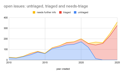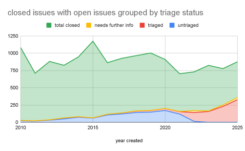 | year created | untriaged | triaged | needs further info | total open | total closed | % closed | % triaged |
