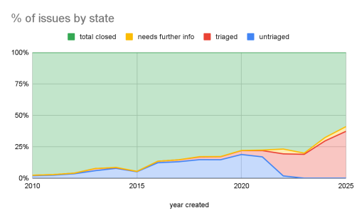 The older an issue is, the more likely it is to be closed. 95% of the issues opened before GitHub, i.e. older than 2016 are closed. Triaging issues also seem to improve closure rate, as our highest closure rate of the past 6 years (80%), and our highest triage rate (95%) both occurred in 2023.