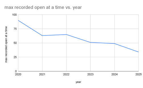 After an all-time high of 334 community pull requests in 2019, NV Access started tracking how many PRs were open each week. This was due to a large amount of community contributions waiting on feedback or support from NV Access. Many of these pull requests were part of a major update of the underlying programming language NVDA is written in; going from Python 2 to Python 3. In 2020 there were over 90 open pull requests, in 2025 we had an all time low of 7 open, and a max of 34 open PRs at a time. This means that now when a PR is opened, it receives prompt attention, and time is minimised from the start of work, to being available in NVDA.