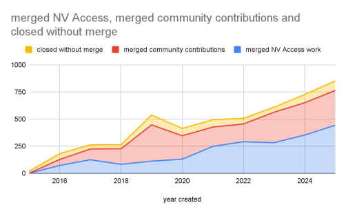 From 2020-2021, to catch up with the back log of community contributions, NV Access only accepted community PRs that were bug fixes, and stopped accepting new features from the community. Since reducing the back log and the subsequent re-opening of feature additions from the community, community PRs have risen year on year up to 321 in 2025.