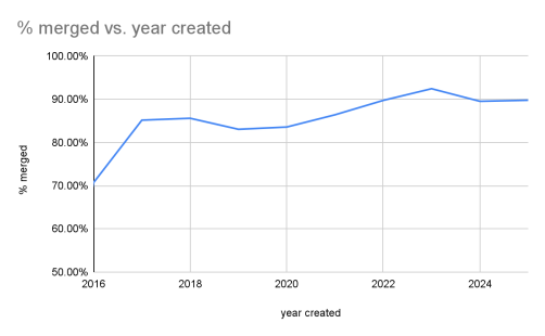 Sometimes, PRs are closed without being added (merged) into NVDA. This could be due to the implementation not working correctly, a new PR being opened to replace it, or the work being abandoned. Overall, 87% of PRs have been accepted and merged. This means that generally when work has started on something, there’s a good chance it gets finished and becomes part of NVDA. This has improved over time, and now is about 90% each year.